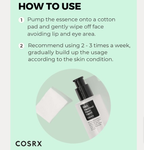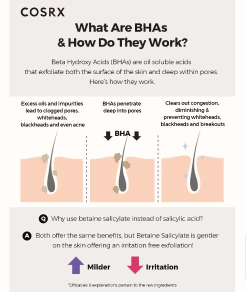 2% BHA (Salicylic acid) যুক্ত Cosrx ব্র্যান্ডের এ এক্সফলিয়েটরটি স্কিনের ডিপ লেয়ারে প্রবেশ করে স্কিনকে এক্সফলিয়েট করে ডেডসেল,বাম্পস ক্লিন করে।এক্সেসিভ অয়েল কমায়।ব্ল্যাক/হোয়াইট হেড দূর করে পোর ক্লিন রাখে।সর্বোপরি স্কিনের পিম্পল দূর করে এবং নতুনভাবে পিম্পল হওয়া প্রতিরোধ করে স্কিনকে স্মুদ রাখে।