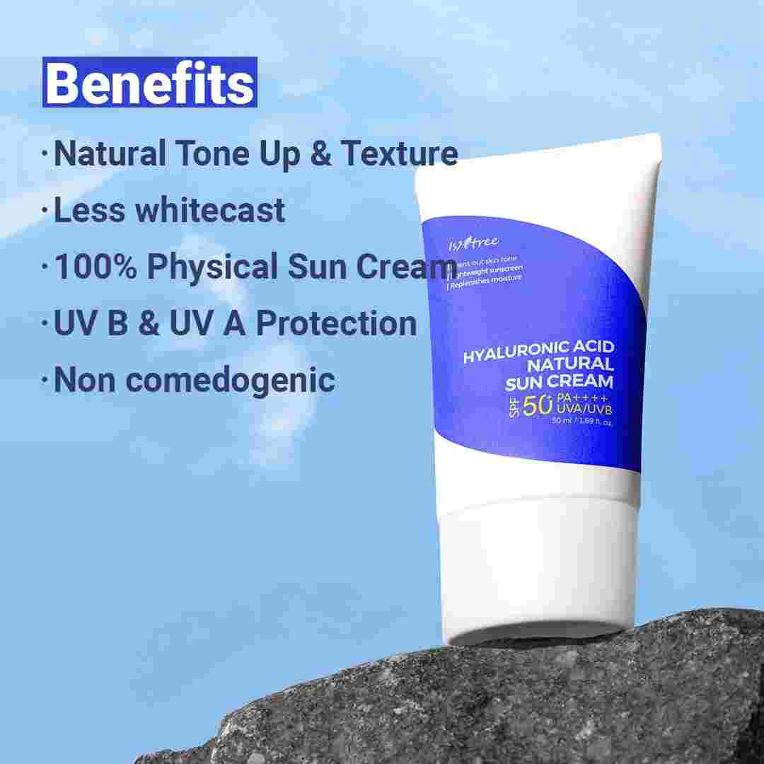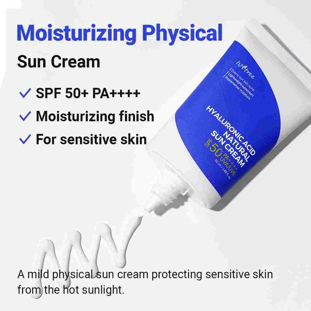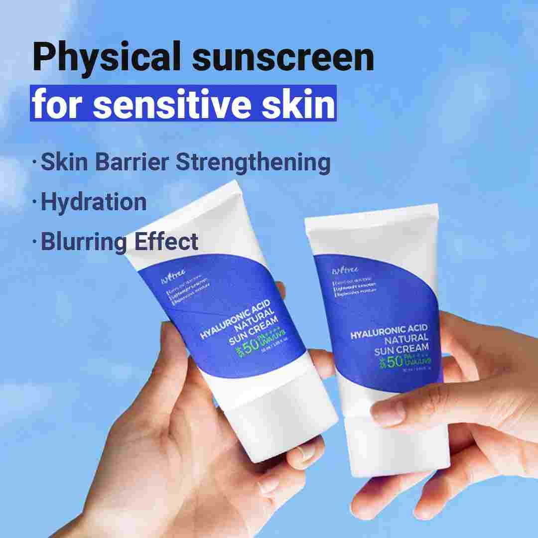 Isntree hyaluronic acid Natural Sun Cream is a physical sunscreen that uses Zinc Oxide and Titanium Dioxide as its active ingredients to provide protection against UVA and UVB rays. In addition to sun protection, this sun cream contains hyaluronic acid and various plant extracts to hydrate and nourish the skin. It is suitable for all skin types, including sensitive skin, and is free of potential irritants such as parabens, sulfates, and artificial fragrances. The Isntree hyaluronic acid Natural Sun Cream has a lightweight, non-greasy formula that absorbs quickly and leaves no white cast, making it ideal for daily use under makeup.